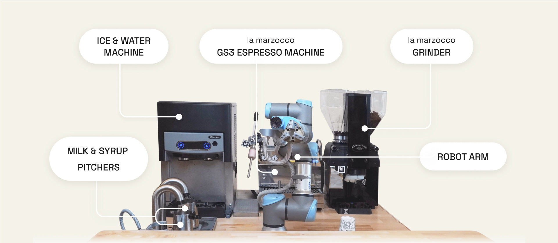 Each unit comes with our signature robotic arm, La Marzocco espresso machine and grinder, ice machine, and refrigerators.
